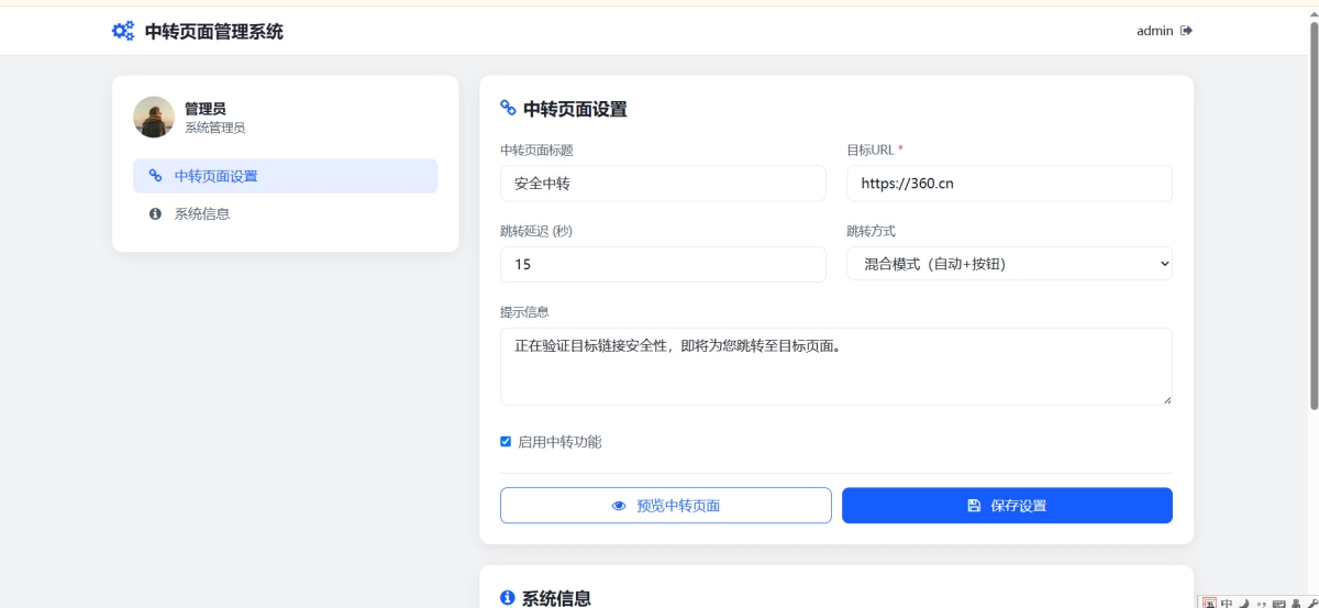 登录管理页面对中转页面进行设置: